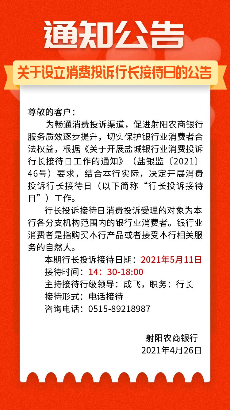 关于设立消费投诉行长接待日的公告